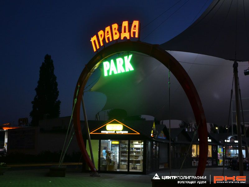 Нашей компанией была изготовлена и смонтирована вывеска на входную группу развлекательного комплекса ПРАВДА ПАРК расположенного на Слобожанском проспете г. Днепр возле ТРЦ НАША ПРАВДА. Вывеска представляет собой объемные элементы высотой 800 мм с точечными диодами красного и зеленого цвета общее количество которых составляет более 3500! шт.
