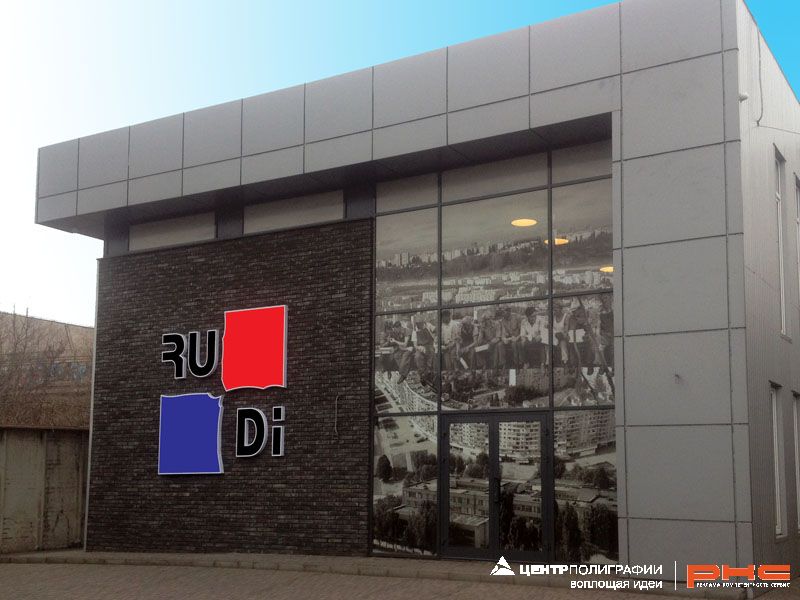 Комплексное оформление фасада главного офиса торговой компании "РУДИ" - крупнейшего поставщика стройматериалов в г. Каменское.