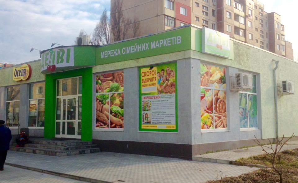 Оформление фасада нового супермаркета сети продуктовых маркетов "Делви" в г. Каменское, б-р Героев.