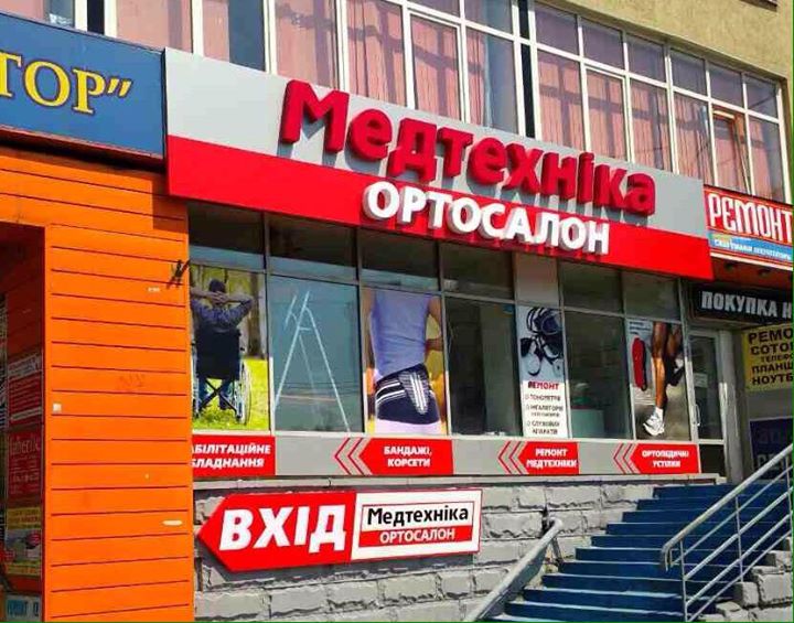 Внутренние и внешние оформление салона сети "Медтехника Ортосалон".