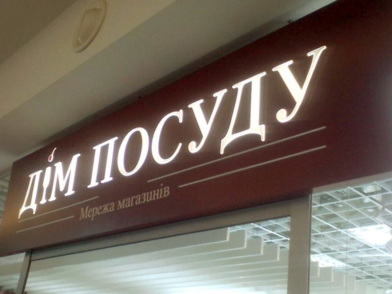 Новый формат вывесок в сети "ДОМ ПОСУДЫ". Первым магазине в новом формате стал магазин в торговом центре "Silver Breeze" на левобережье Киева. Вывеска выполнена из композита цвета бордо с фрезерованным элементами и инктрустированными буквами из 10 мм прозрачного акрила. При таком способе изготовления вывески выглядят наиболее стильно, лаконично и дорого. г. Киев, ул. Панаса Мирного, 1 ТЦ "Silver Breeze".