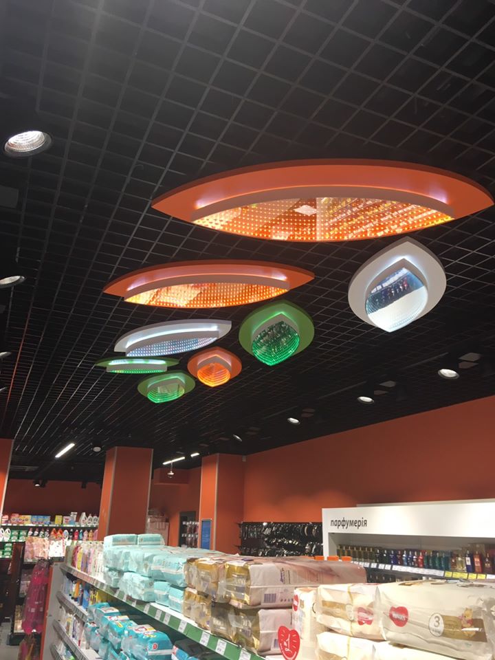 Поделимся с Вами также нашей работой по оформлению интерьера магазина "ЕВА" в городе Днепр, пр. Яворницкого,60.Мы выбрали нестандартные решения в данной рекламе - световые элементы «листики» с эффектом зеркальной бесконечности!