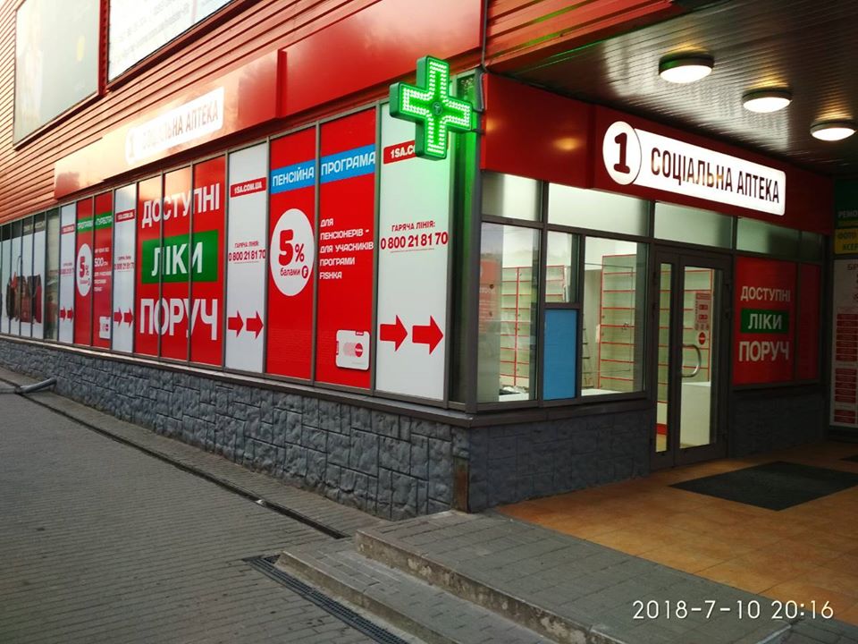 Наружное оформление нашей компанией Первой Социальной Аптеки в г. Павлоград ТЦ "Гулливер".