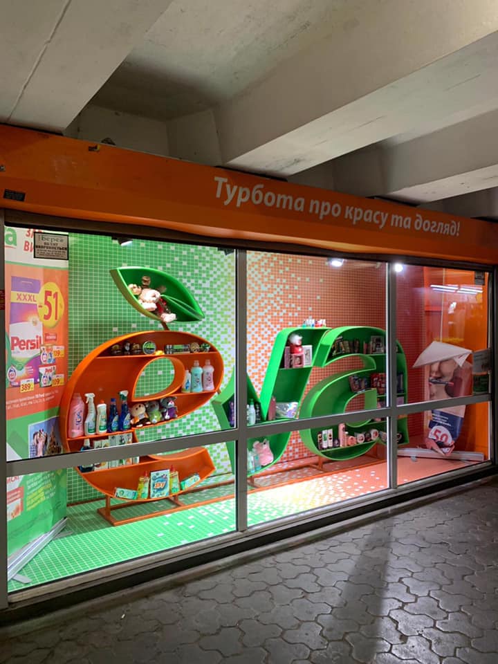 Так получилось и на этот раз: г. Киев, метро "Дружбы Народов" - нестандартное оформление витрины магазина Ева с полками для товара в виде логотипа компании.