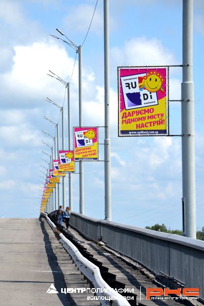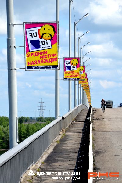 Торговая компания "РУДИ" заказала изготовление и монтаж баннерных флажков расположенных на мостовом переходе через реку Днепр. Веселые и яркие улыбки будут радовать жителей Днепродзержинска, проезжающих по мосту.
